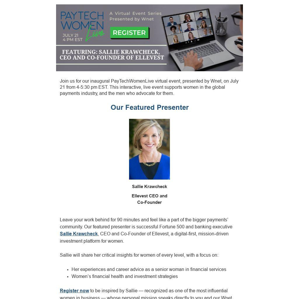 Join us for our inaugural PayTechWomenLive virtual event, presented by Wnet, on July 21 from 4-5:30 pm EST. This interactive, live event supports women in the global payments industry, and the men who advocate for them.