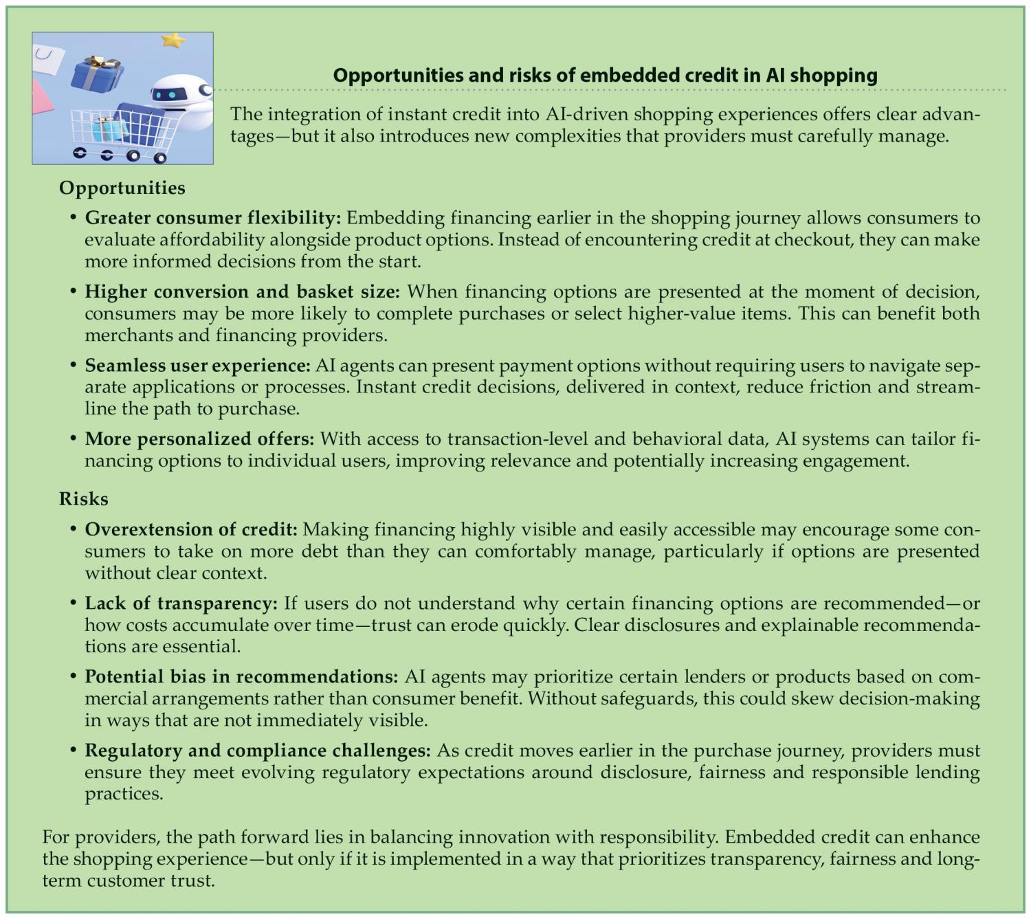 Clear disclosure of repayment terms, visible comparisons between payment options, and safeguards against excessive borrowing will all be critical components of trustworthy AI-driven commerce.
