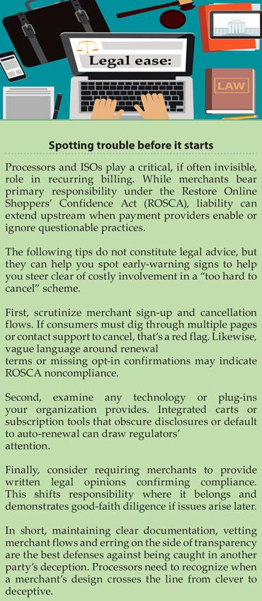Somewhere in the matrix of relationships behind such a service is a payment processor and perhaps an ISO dutifully processing the monthly payments. Are they liable for the heavy hand of their merchant? Each case like this would turn on the individual facts, so this column sets out some of the key legal questions in play and suggests some ideas for how ISOs and payment processors can spot them.
