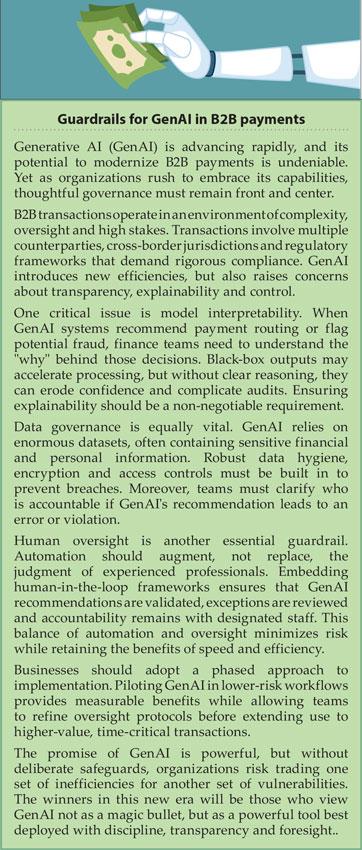 However, as we embrace GenAI's potential, we must recognize that it builds upon, rather than replaces, existing proven technologies. Blockchain, robotic process automation (RPA), and straight-through processing (STP) systems already address many challenges that GenAI is expected to solve, including reducing transaction friction, strengthening security protocols and streamlining reconciliation processes. The key insight is viewing GenAI not as revolutionary replacement technology, but as intelligent analytics and insights layers that optimize existing robust infrastructure. In the high-stakes, heavily regulated B2B payments environment, proper oversight and thoughtful guardrails remain essential regardless of the underlying technology stack.