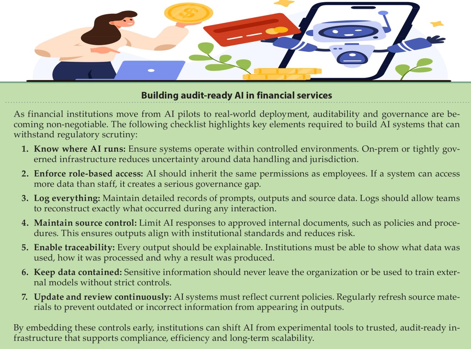 None of this, of course, removes human accountability. For banking and payments leaders to be confident in audit-ready AI, the standard is to show where the model runs, what it can access, and which controls were applied. For AI to scale in financial services, these are the first guardrails to establish: securely contained, easily auditable, and tightly governed from the start.